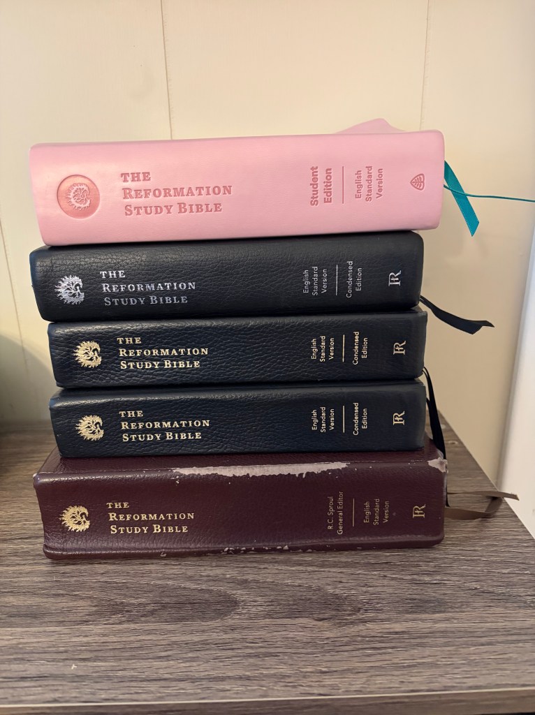 They all have commentaries which help explain the verses. My husband’s is the large one on the bottom of the pile. His includes the many creeds and confessions of the early church, and it is very heavy!