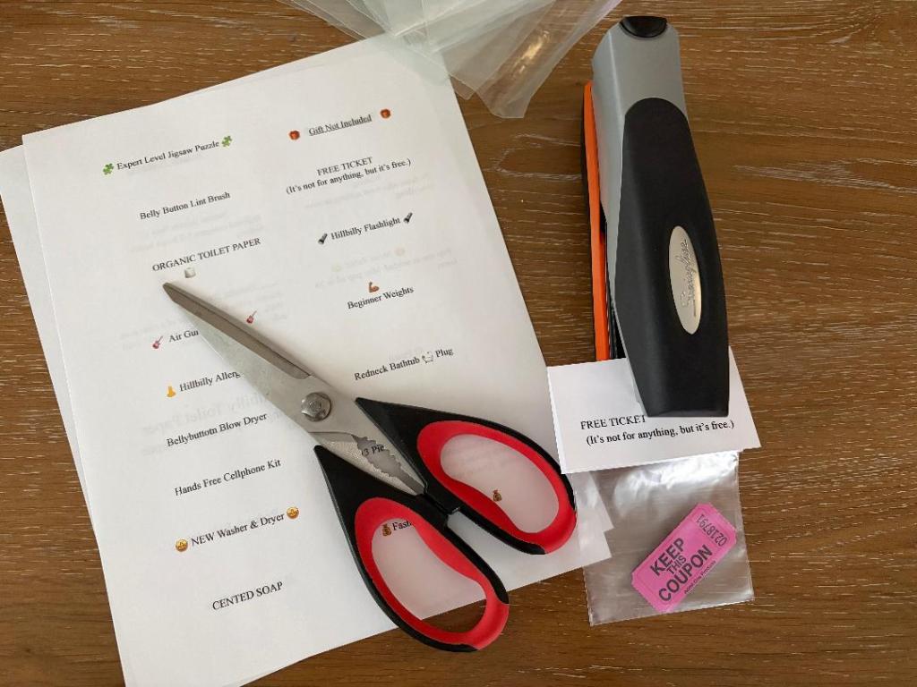 What you need to do first is choose what you will gift your gags in: a stocking, gift box or gift bag. Then either print the attached labels or handwrite some of your own. Trim the labels to size. Fill a baggie with the matching items. Staple the label to the baggie, and fill the stocking, box or bag.